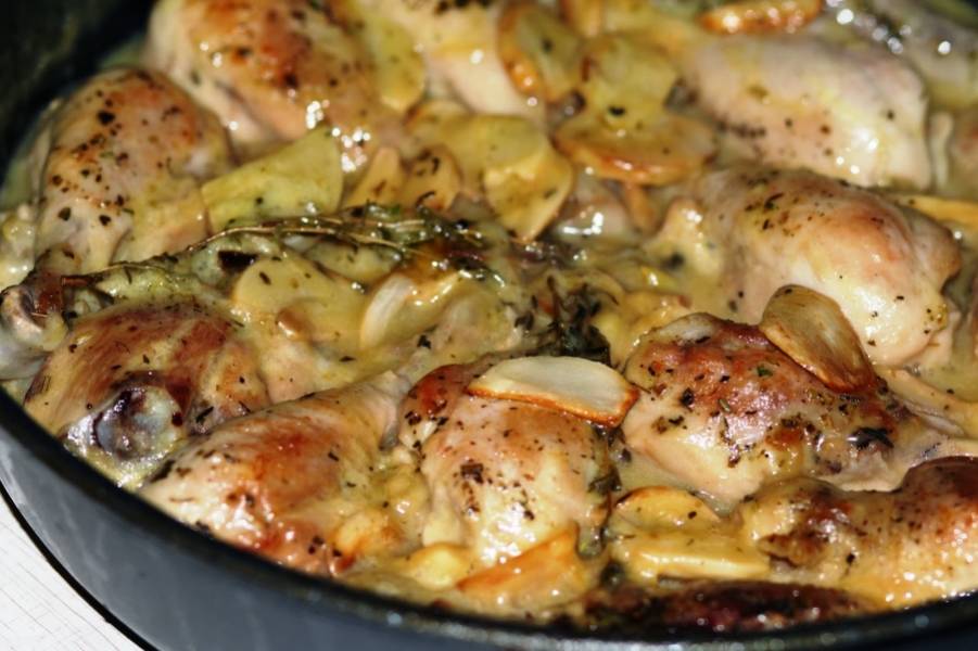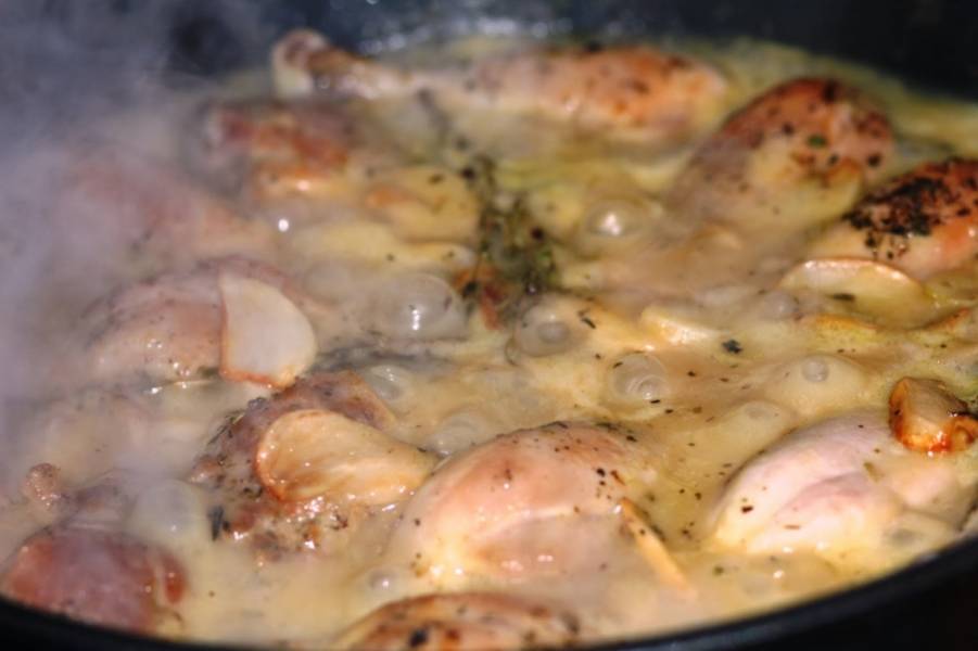 Перекладываем к курице обжаренный чеснок и вливаем крахмально-горчичный соус, добавляем сушеный тимьян и в веточках.