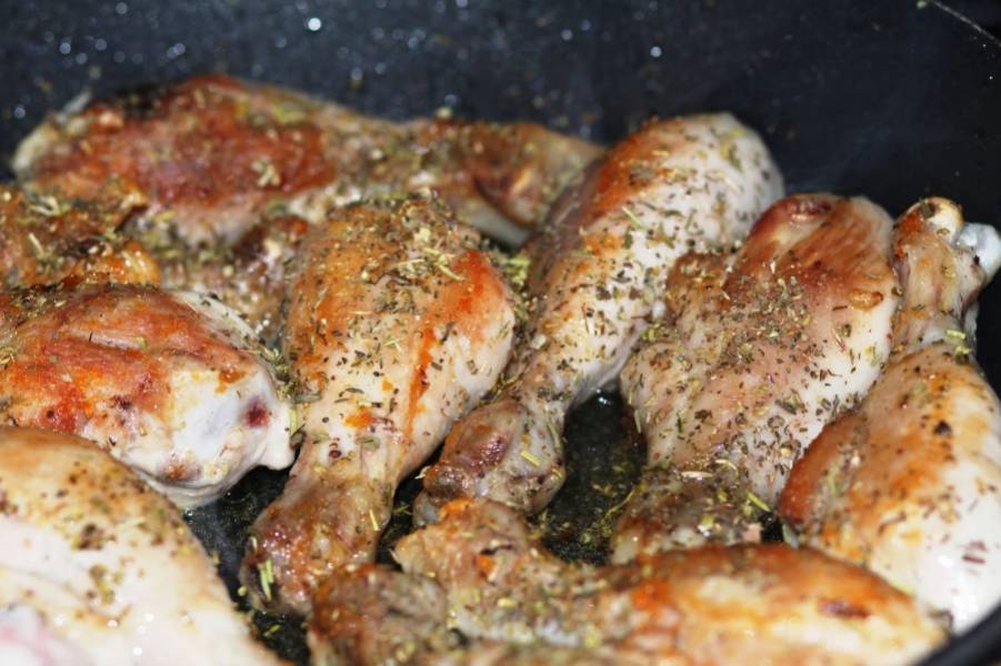 Затем приправляем курицу итальянскими травами, солим и перчим ее.