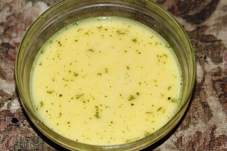 Вливаем куриный бульон и тщательно все перемешиваем, чтобы не осталось комочков.