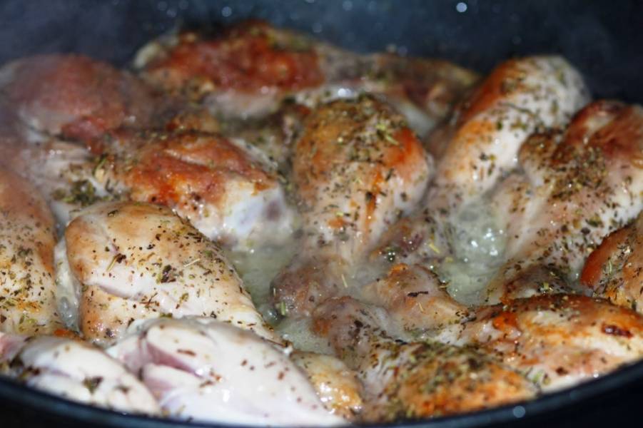 Вливаем на сковороду вино и тушим курицу минут 5-7 до полного испарения жидкости.