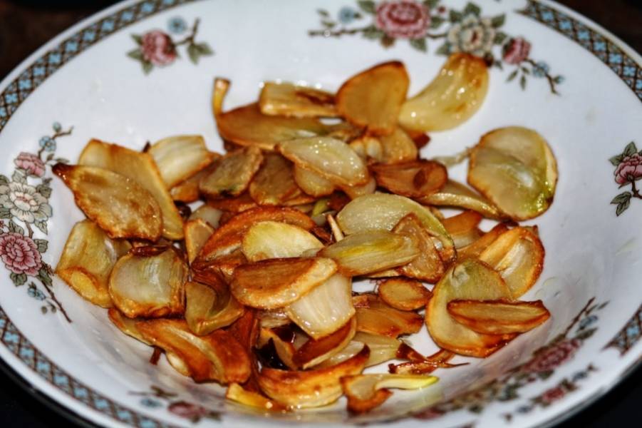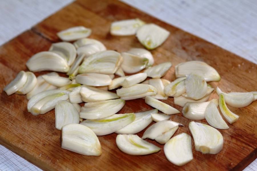 Для начала чистим побольше чеснока и нарезаем его на пластинки.