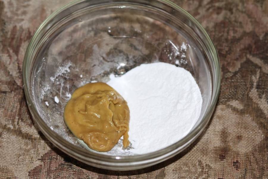 Высыпаем в мисочку крахмал (1 столовая ложка) и добавляем горчицу.