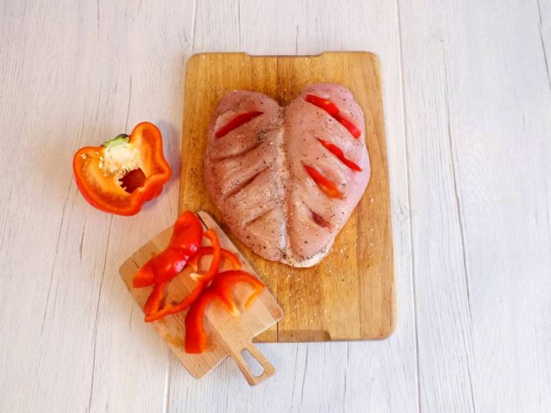 Болгарский перец нарежьте на полукольца и вставьте в разрезы.