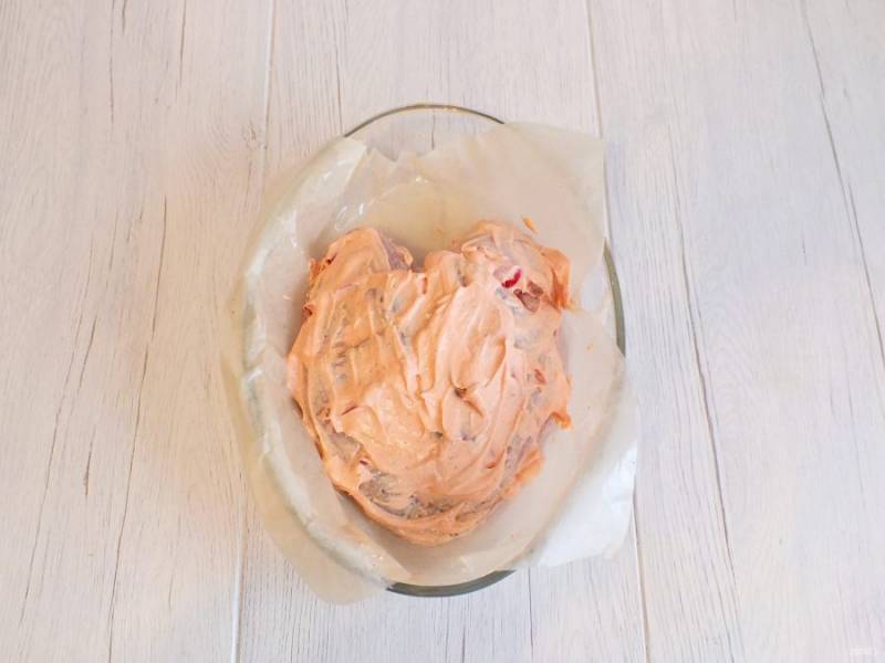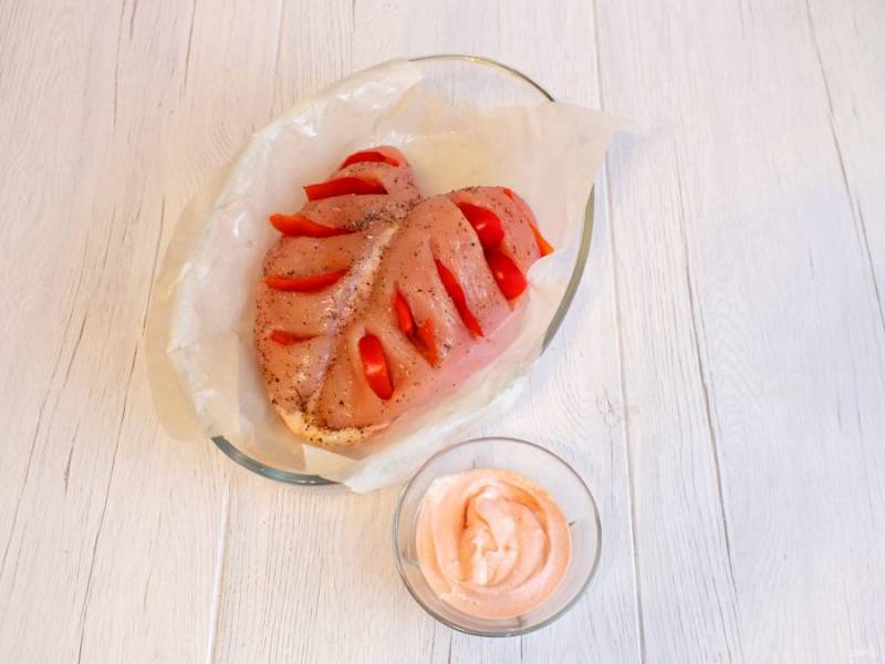 Возьмите просторную форму. Застелите пергаментом, смажьте его 1 с.л. растительного масла. Переложите в форму подготовленную грудку. В отдельной ёмкости смешайте сметану и томатный соус.