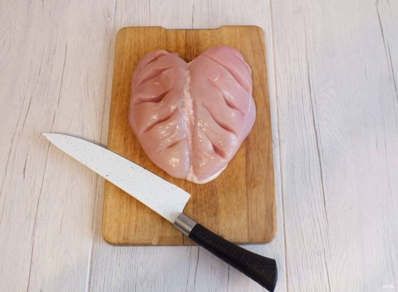 С грудки снимите кожицу, промокните бумажным полотенцем. Острым ножом с каждой стороны грудки сделайте глубокие надрезы.