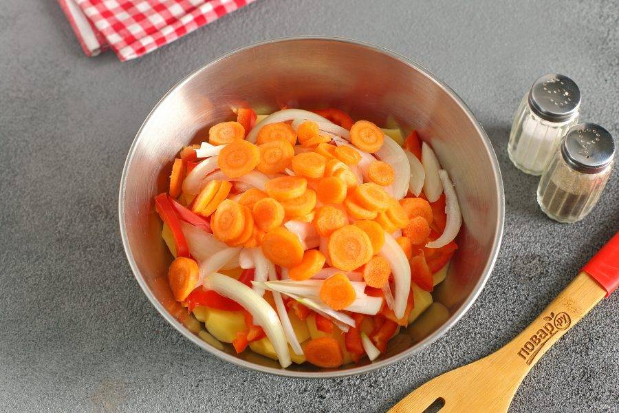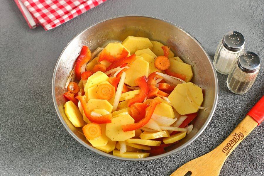 Добавьте к овощам растительное масло, соль и специи по вкусу. Перемешайте.