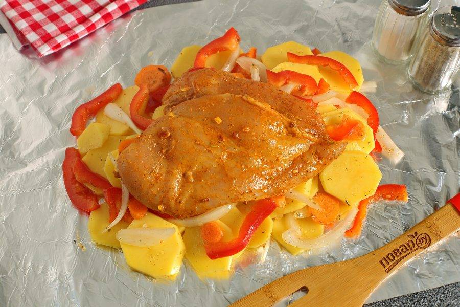 Выложите овощи на кусок фольги. Поверх овощей выложите куриную грудку. Плотно укутайте курочку с овощами фольгой, чтобы сок не вытекал на противень и запекайте в духовке при температуре 180 градусов 30-40 минут.