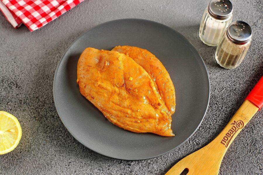Грудку натрите солью и специями полейте соком лимона, сбрызните растительным маслом и оставьте мариноваться на 20-30 минут.