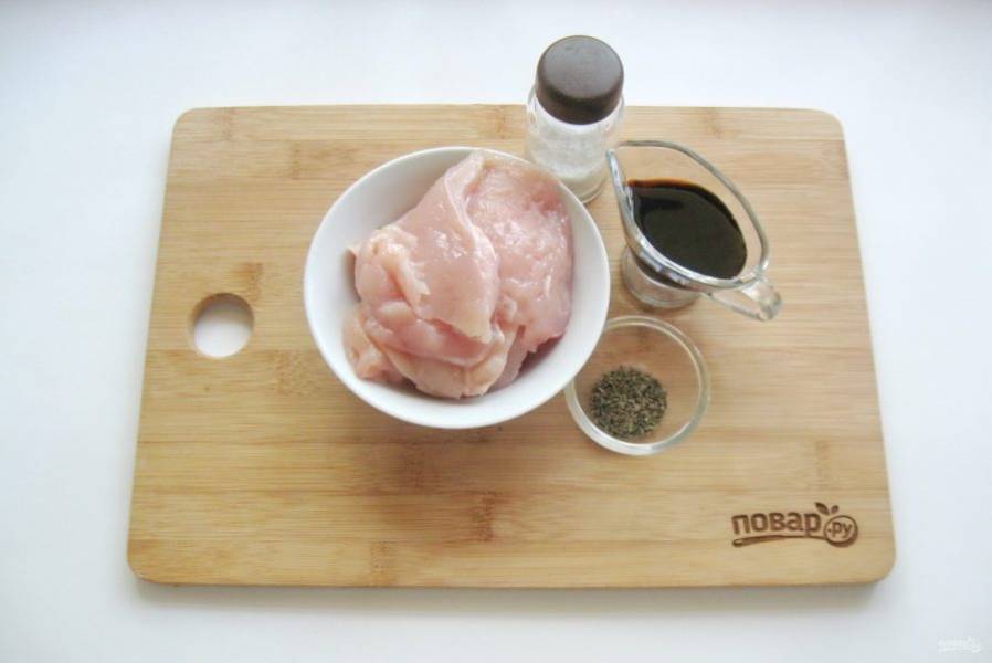 Мясо посолите по вкусу, добавьте любые специи, у меня это сушеный базилик. Налейте соевый соус. Дайте постоять куриной грудке в маринаде минимум час.