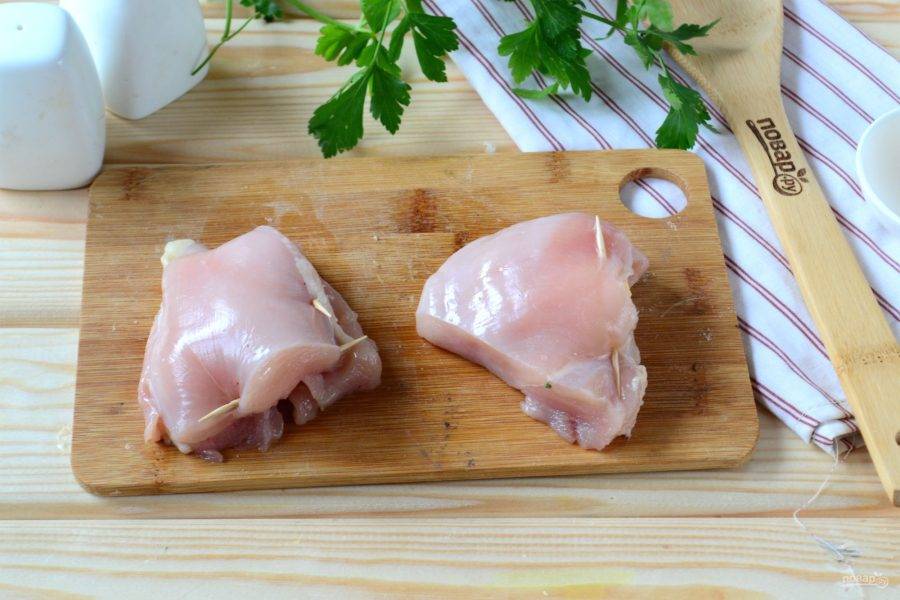 Наполните этот кармашек кусочком твердого сыра, а место разреза закрепите зубочистками, чтобы сыр, когда расплавится, не вытекал.