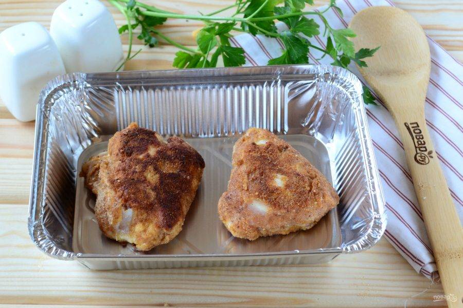 Теперь выложите грудки на небольшую форму для выпекания и отправьте в духовку на 15 минут (температура — 180 градусов).