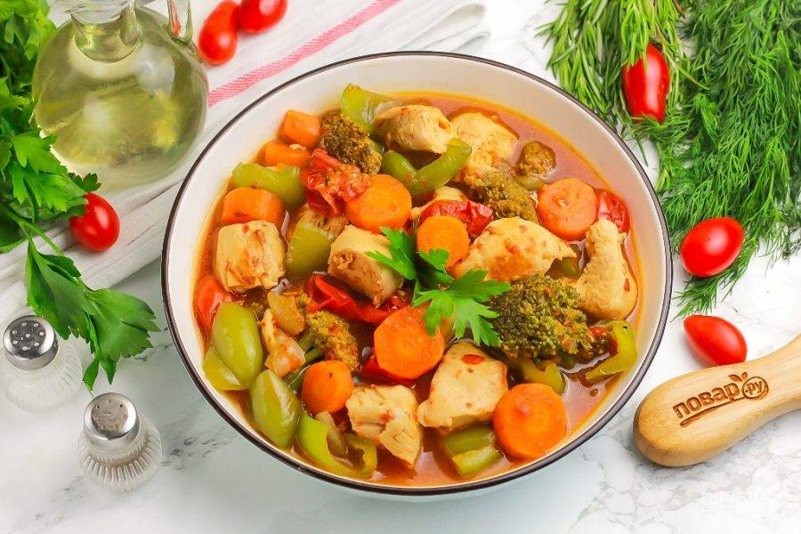 Выложите тушеную куриную грудку с овощами в глубокие тарелки, полейте соусом и подайте к столу горячей. Дополните лавашом, багетом, чиабаттой и т.д. Приятного вам аппетита!