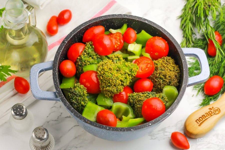 Выложите следом нарезку болгарского перца и соцветия брокколи.