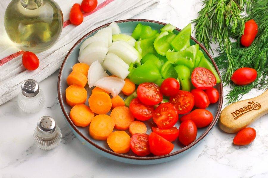 Нарежьте морковь кружочками, лук — полукольцами, перец — кубиками или лентами, а помидоры — разрежьте пополам.