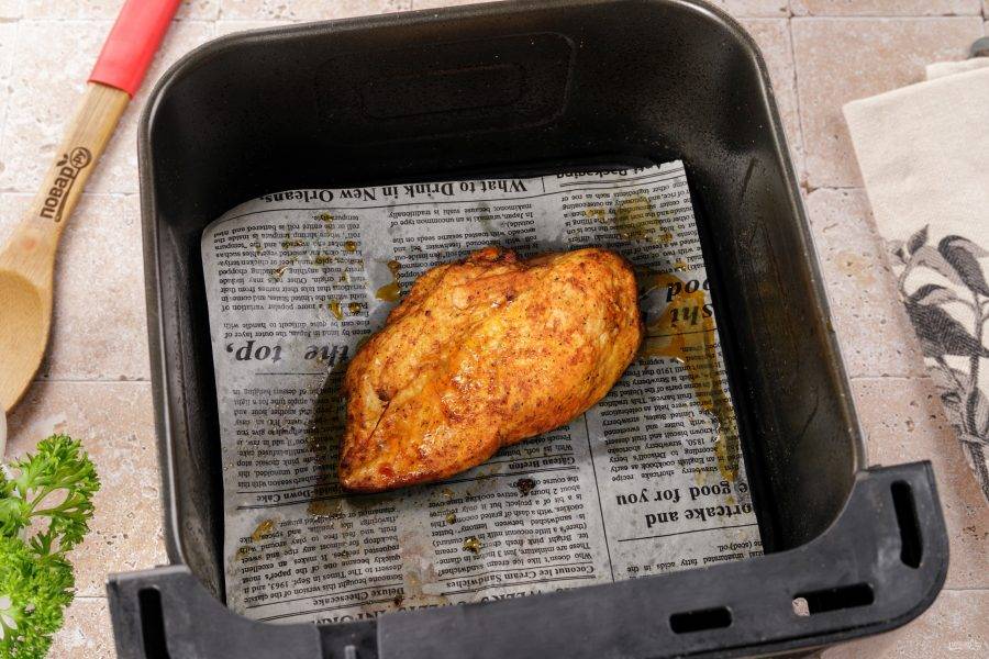 Важно! Не пересушите курицу! При необходимости можно перевернуть филе один раз в процессе приготовления. Когда аэрогриль закончит свою работу, оставьте куриное филе в нем еще на 5 минут, чтобы оно отдохнуло и дошло до готовности.