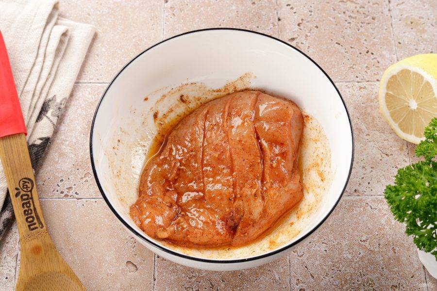 Куриное филе помойте и обсушите. Сделайте продольные надрезы на курице. Так маринад лучше пропитает мясо.