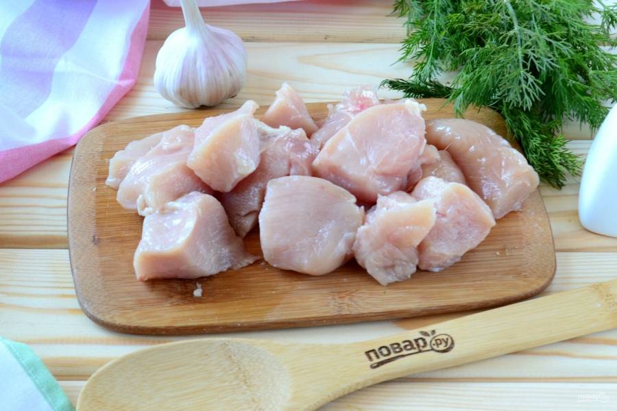 Куриную грудку порежьте на куски среднего или крупного размера. Но чем крупнее вы порежете, тем больше времени уйдет на маринование и запекание.