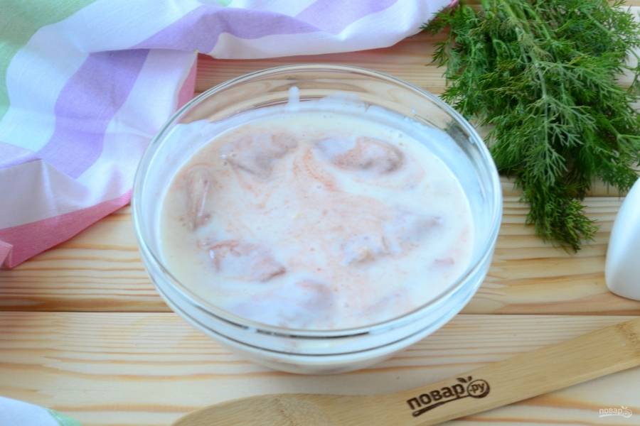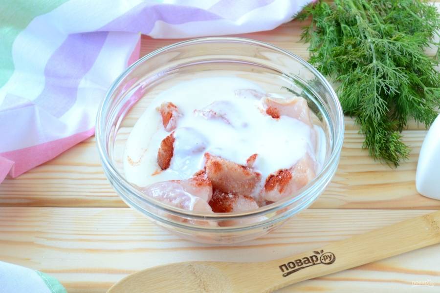 Сложите кусочки курицы в глубокую миску, добавьте соль и паприку. Паприки добавляйте по вкусу, мне нравится ее много, сочетание паприки с курицей для меня просто идеально. Чеснок порежьте на пластины и также отправьте к курице. Залейте все кефиром.