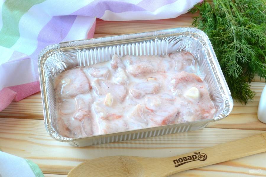 Хорошенько перемешайте курицу в маринаде, накройте миску пищевой пленкой и отправьте в холодильник на 1-2 часа.