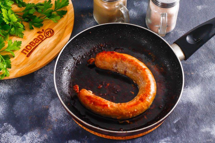 Несколько раз переворачивайте колбасу на другую сторону для равномерной прожарки.