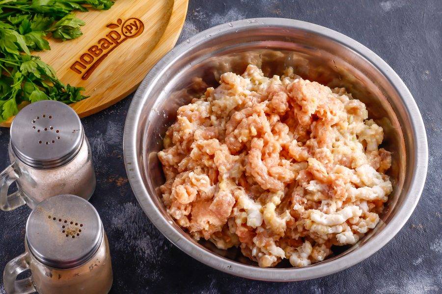 Всыпьте соль и молотый черный перец, тщательно вымешайте фарш и поместите его в холодильник минимум на 2 часа, чтобы он пропитался чесночно-луковым ароматом.