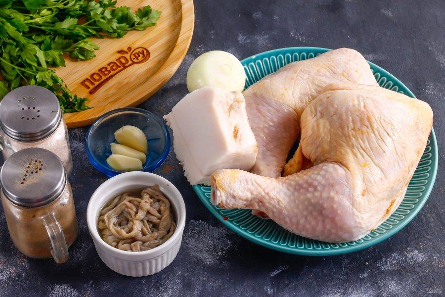 Подготовьте указанные ингредиенты. Промойте окорочка, срежьте с них заднюю часть и плотную кожу. Очистите от кожуры лук и чеснок.