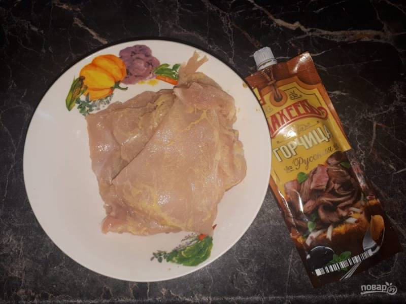Порезать на кусочки и отбить куриное филе, смазать каждый отбитый кусок горчицей от "МахеевЪ". Оставить на пару часов, но можно и на ночь в холодильнике.