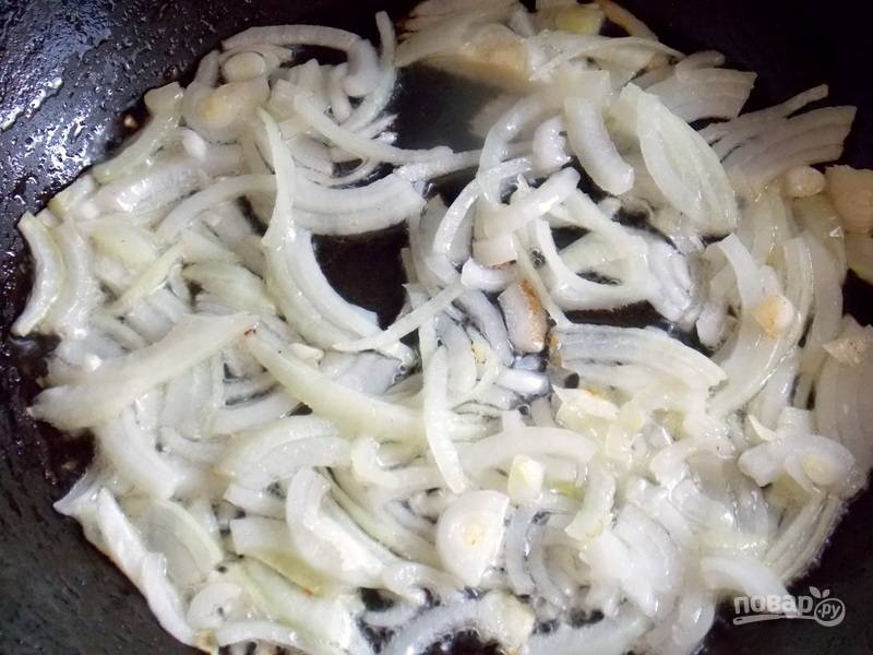 Почистите лук, порежьте его полукольцами. Положите в сковороду и обжаривайте 3-4 минуты.