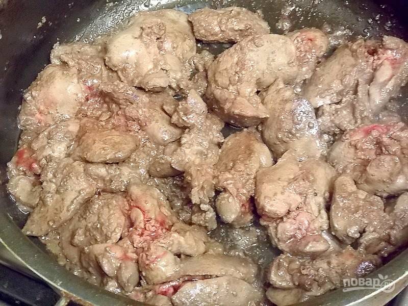 Помойте печень, порежьте на куски и обжарьте на горячем масле до румяной корочки. Уберите со сковороды в чашу и закройте крышкой.