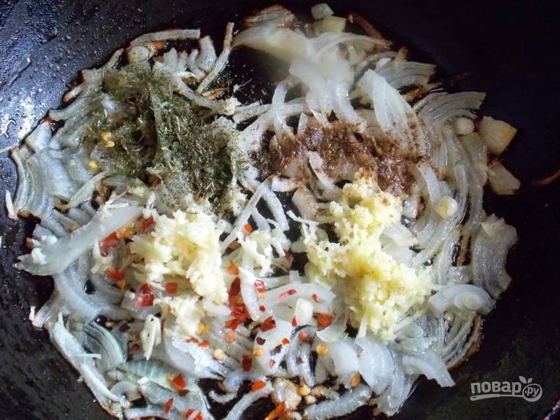 Добавьте к луку тертые имбирь и чеснок, острый перец, сухой тимьян и корицу. Обжарьте еще 1 минуту.