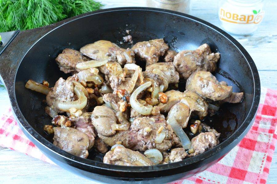 Выложите печень, орешки и обжаривайте все вместе еще 5-7 минут, помешивая. Посолите и поперчите по вкусу.