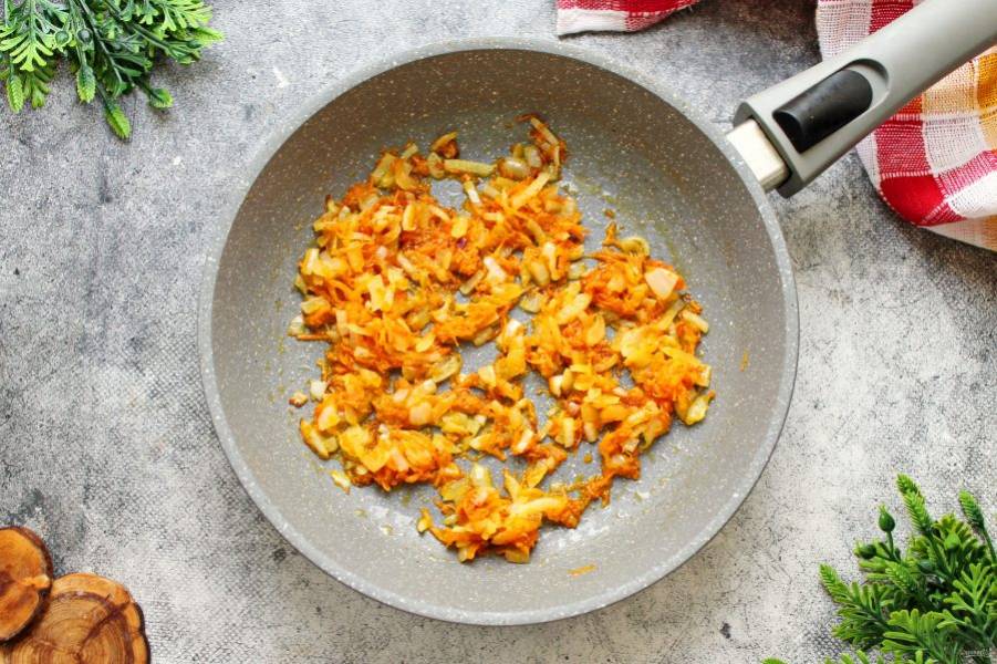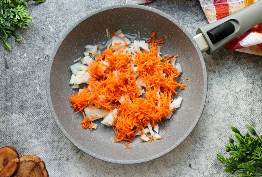 Морковь потрите на средней терке и выложите к луку.