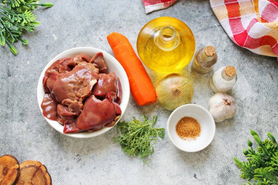 Подготовьте все необходимые ингредиенты для приготовления куриной печени с луком и морковью. Овощи почистите и сполосните.