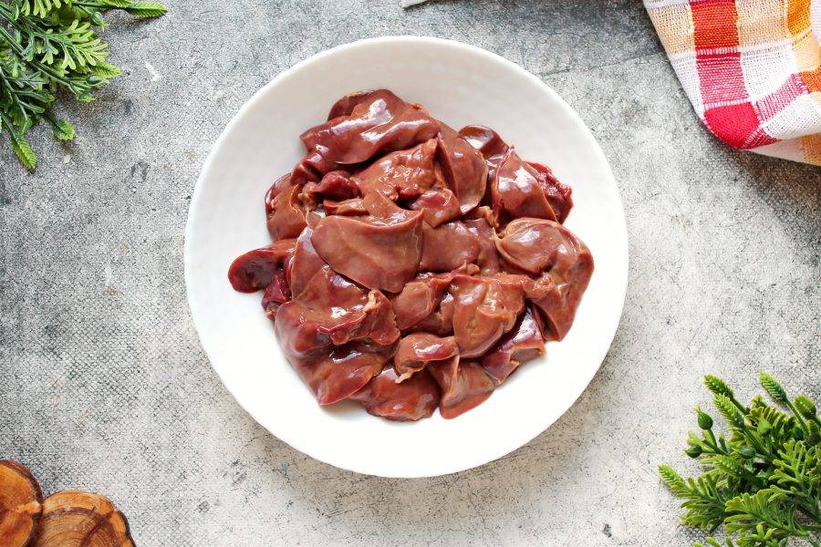 Куриную печень обработайте, отрезая жилки и очень аккуратно желчный пузырь. Порежьте печень на крупные куски.