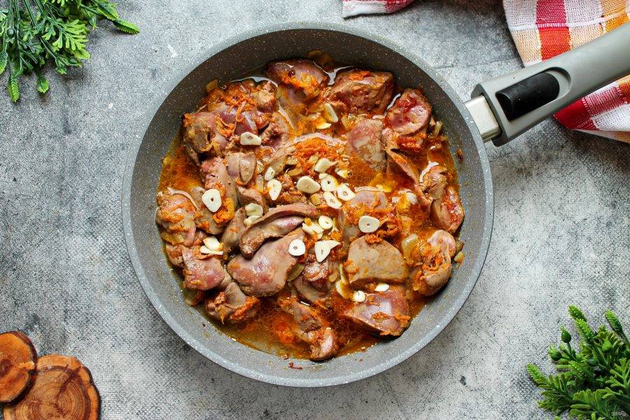 Влейте к куриной печени горячую воду и перемешайте. Доведите все до кипения, закройте крышкой, уменьшите огонь и тушите все в течение 10 минут.