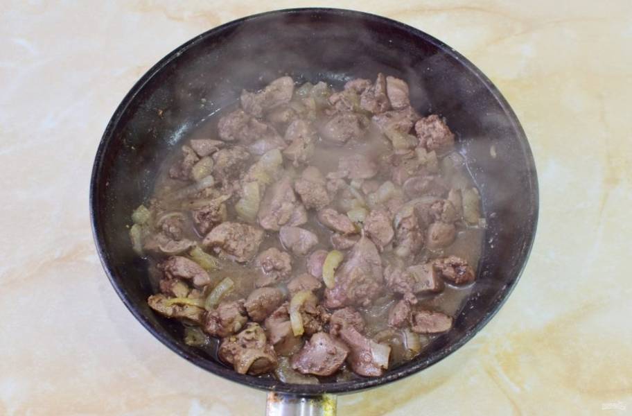 Когда печень изменила цвет добавьте немного соли и специи. Накройте сковороду крышкой и тушите на небольшом огне 7-10 минут.