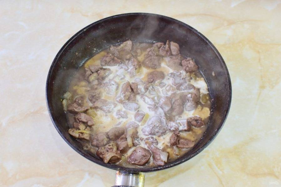 Затем подлейте в сковороду сливки и прогрейте все вместе еще 1-2 минуты. Снимите сковороду с огня.