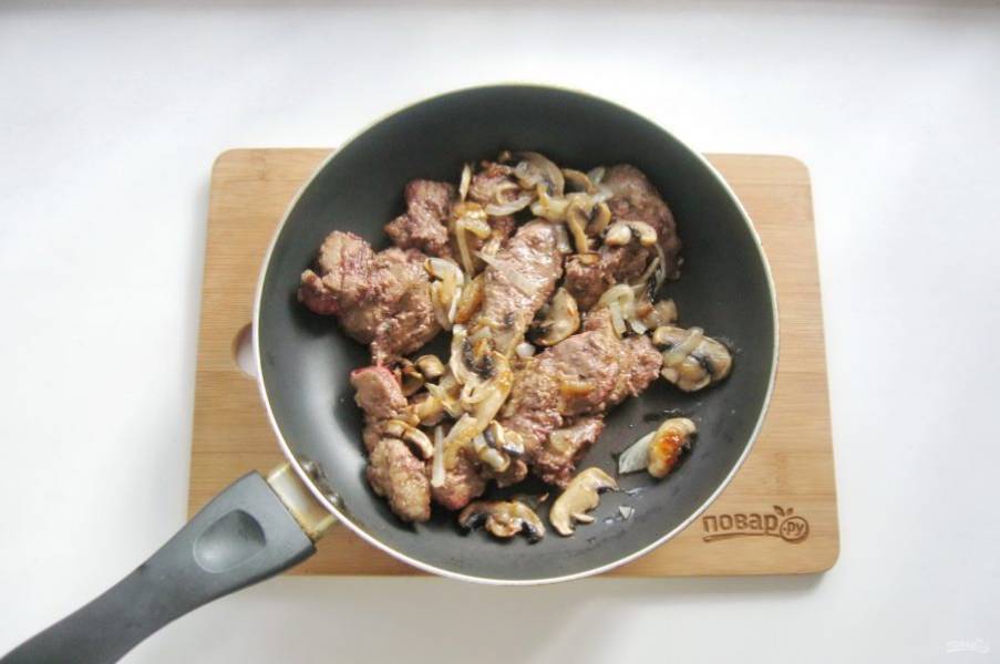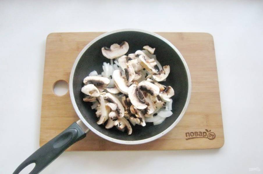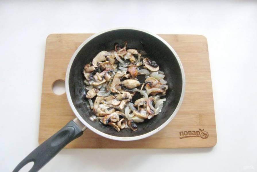 Налейте подсолнечное масло и обжаривайте лук с грибами 8-10 минут, перемешивая.