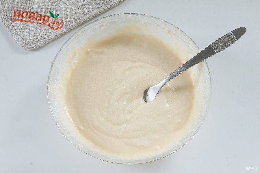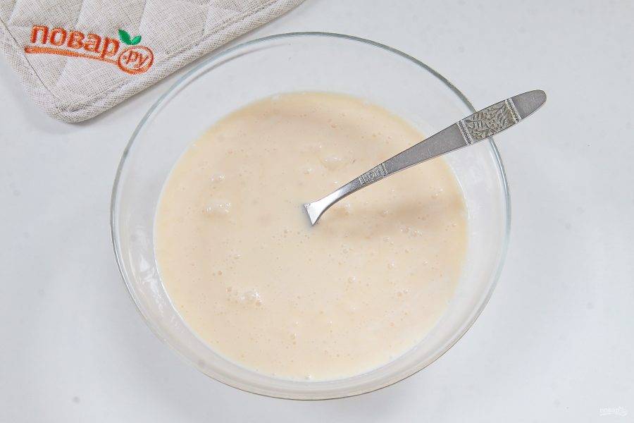 Для кляра соединить яйца, сметану и пропущенный через пресс чеснок. Посолить по вкусу, добавить по желанию черный перец и перемешать.