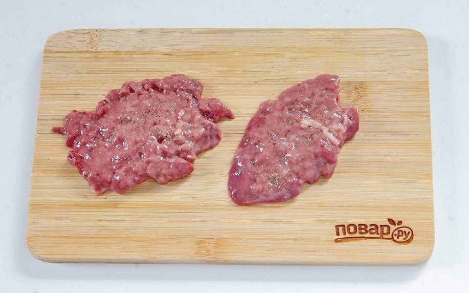 Печень нарезать порционно и чуть отбить. Посыпать перцем или любимыми специями.