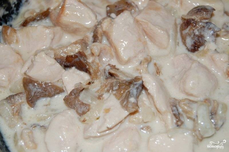 Добавляем к курице грибы и лук. Заливаем все сметаной, кладем специи по вкусу. Тушим на медленном огне 10-15 минут до полной готовности.
