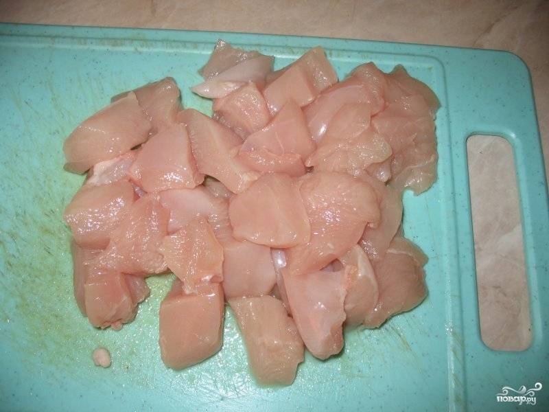 Обжариваем курочку на растительном масле до золотистого цвета. Параллельно обжариваем грибочки с измельченным луком (на отдельной сковороде).