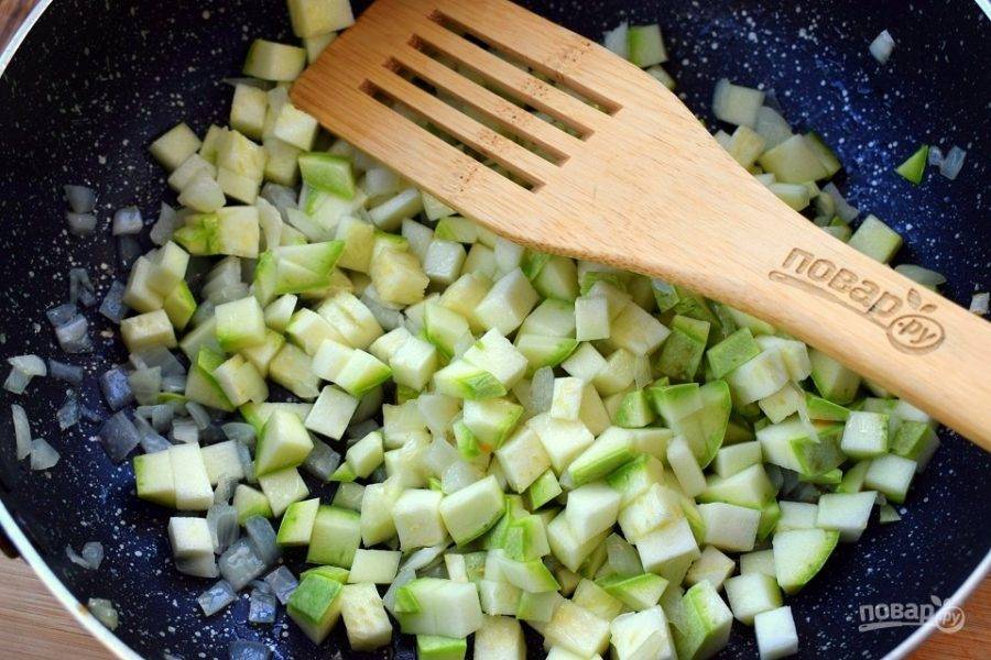 На разогретом масле пассеруйте измельченный лук до прозрачности. Затем добавьте кабачки, нарезанные на мелкие кубики, обжаривайте в течение 5 минут.