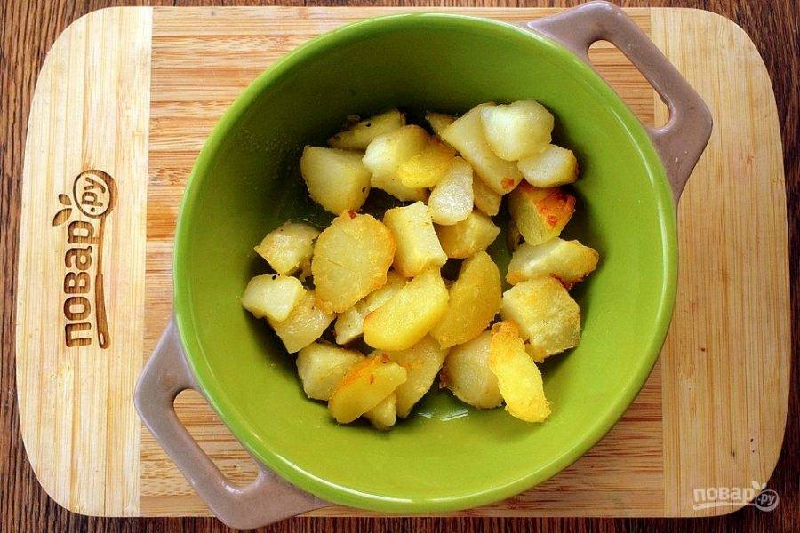 Картофель очистите, нарежьте кубиками и обжарьте на растительном масле до золотистой корочки. Выложите его в форму для запекания.