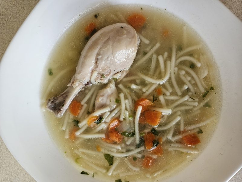 Куриное мясо готово, вынимаем окорочка из бульона, а бульон процедим. Овощи выбрасываем.