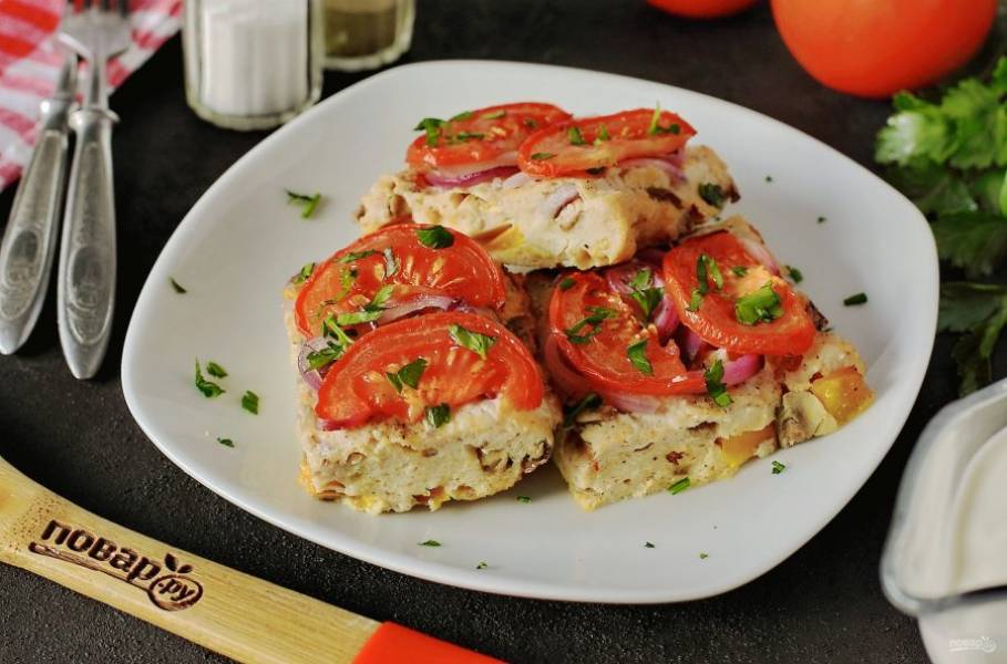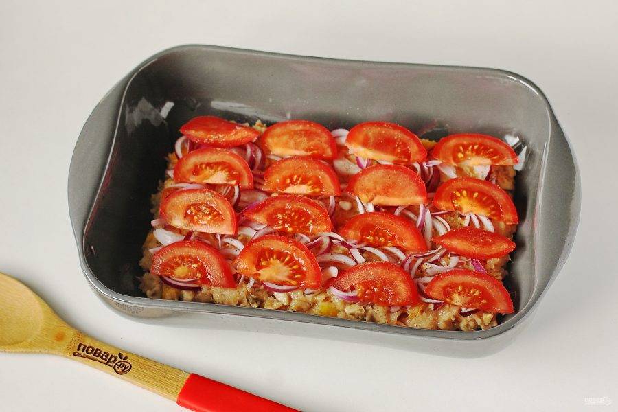 Сверху распределите нарезанный полукольцами лук и нарезанные дольками помидоры. Посолите, поперчите и запекайте при температуре 180 градусов около 30 минут.