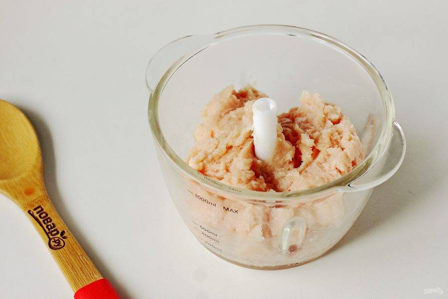 Куриное мясо отделите от костей. Измельчите филе при помощи блендера или мясорубки.