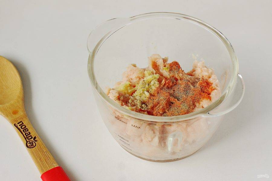 Добавьте к фаршу пропущенный через пресс чеснок, соль по вкусу и специи.