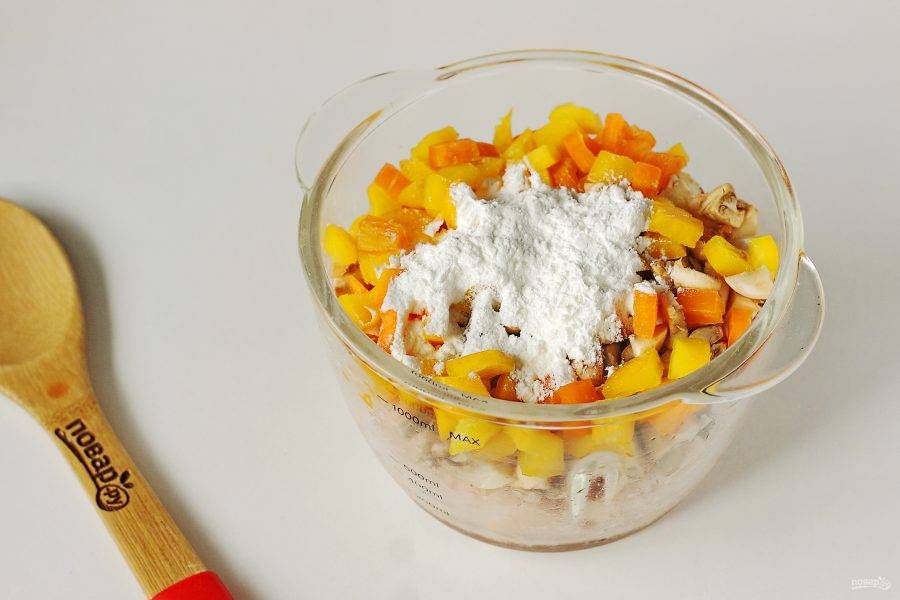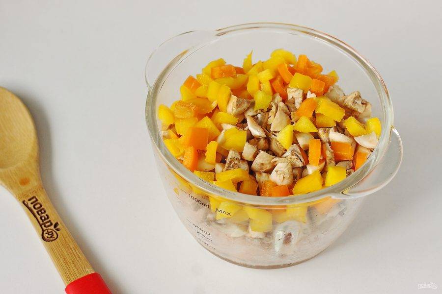 Болгарский перец и грибы нарежьте кубиками и добавьте к фаршу.