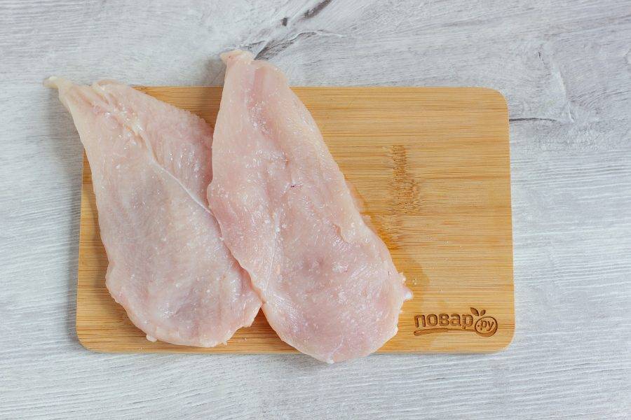 Филе грудки или другой части помойте и разрежьте вдоль пополам, если филе большое. Посолите, поперчите по вкусу.